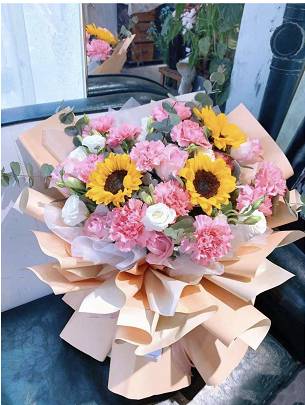 3朵向日加19朵粉康加3朵粉玫包花束,如图包 |