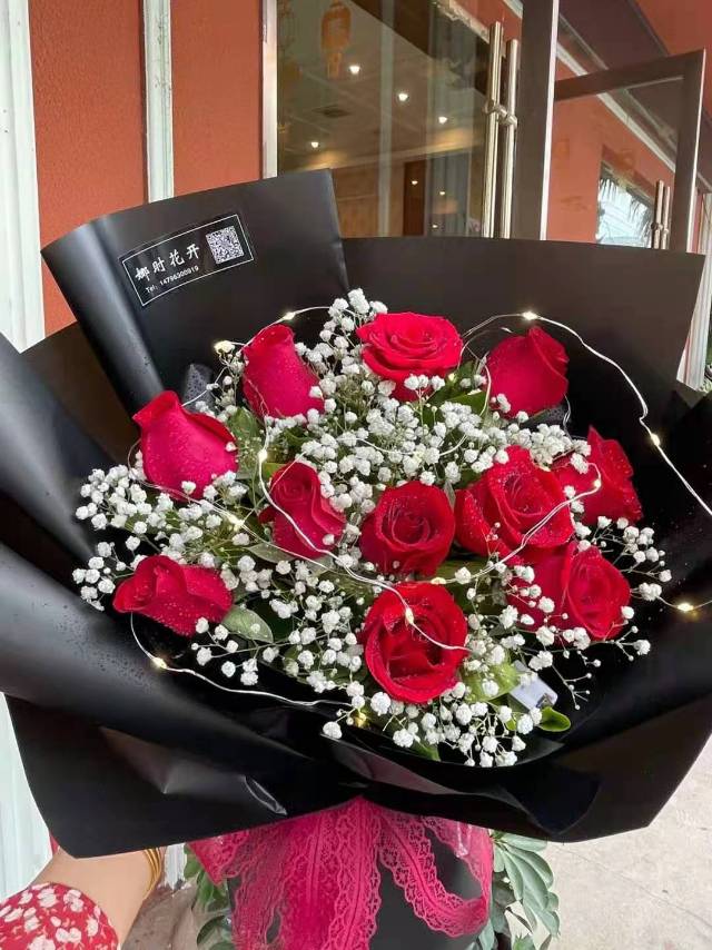 11支红玫瑰加满天星加灯鲜花束。如图包 |