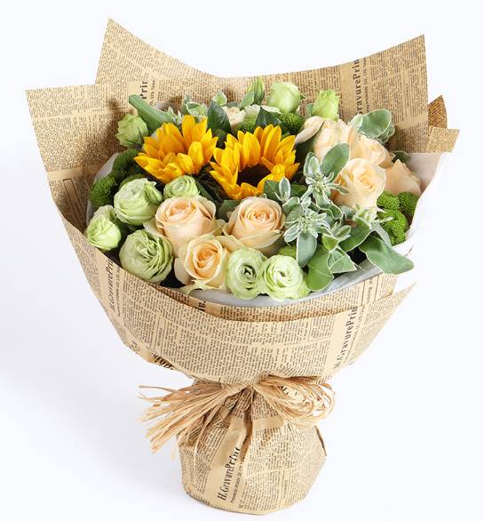 夜上海论坛11朵香槟玫瑰+2朵向日葵+5朵绿色梗桔花束 |