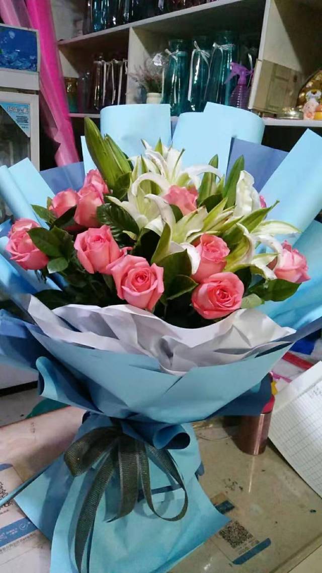 夜上海论坛11朵代安娜粉玫加1支多头白百合鲜花束。 |