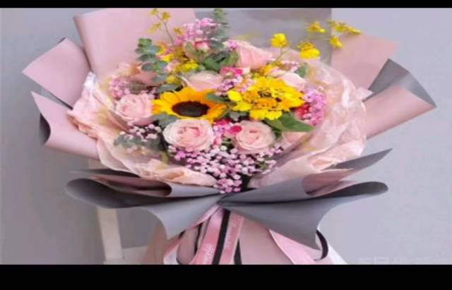 11支粉玫瑰2支向日葵满天星花束,如图 |