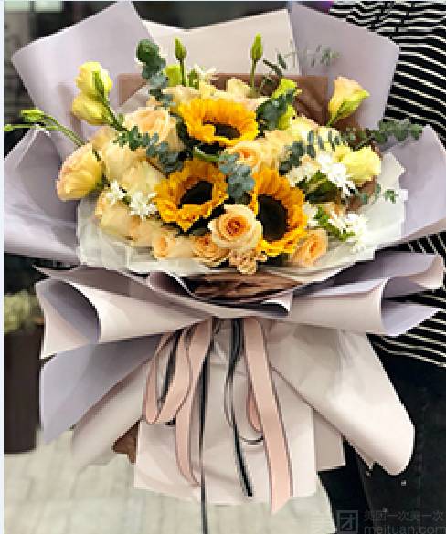 夜上海论坛16朵香槟玫瑰3朵向日葵梗桔 鲜花束,如图包 |