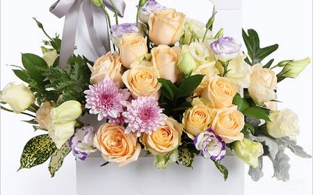 香槟玫瑰19枝、香槟色桔梗3枝、紫色桔梗2枝,搭配适量紫色小菊、银叶菊、(鲜花包装银灰色缎带花结、白色手提花篮) |