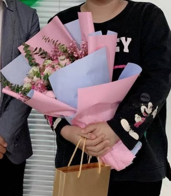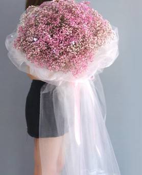 夜上海论坛一大束粉色满天星花束(直径大概在60CM)。+彩灯。白色雾面纸。白纱包装(纱要留长一些)。如图制作。 |
