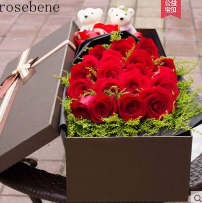 25朵红玫瑰+2熊+咖啡色礼盒+如图黄英搭配丰满 |