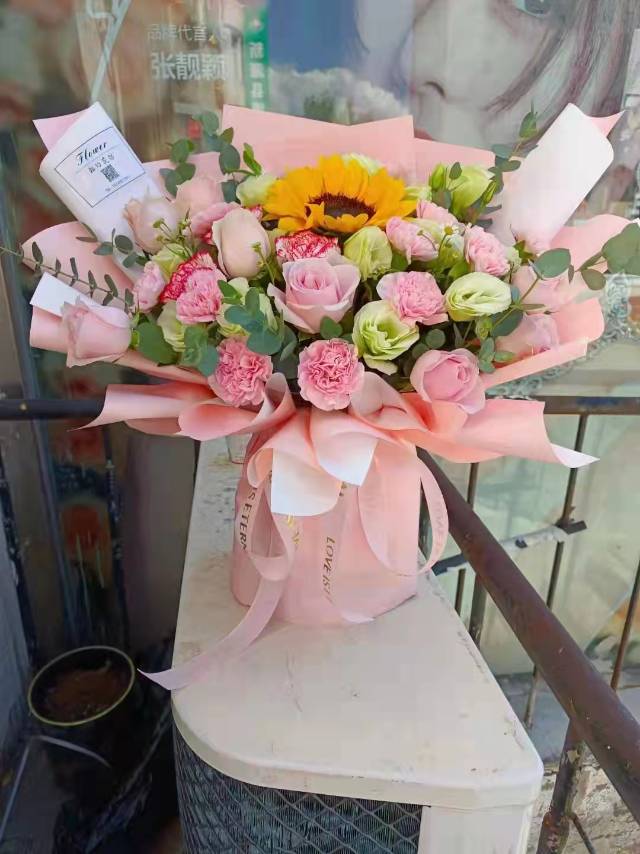 夜上海论坛1朵向日加11朵粉康加11朵粉玫鲜花束,如图包 |