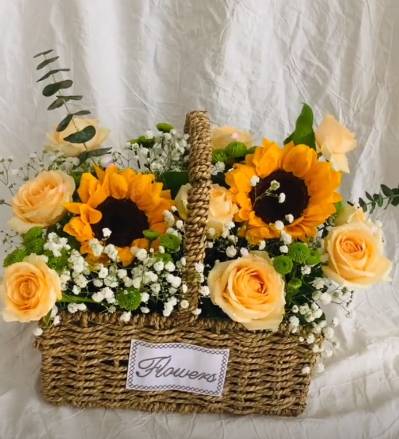 夜上海论坛9朵香槟2向日葵白色满天星小花篮 如图 |