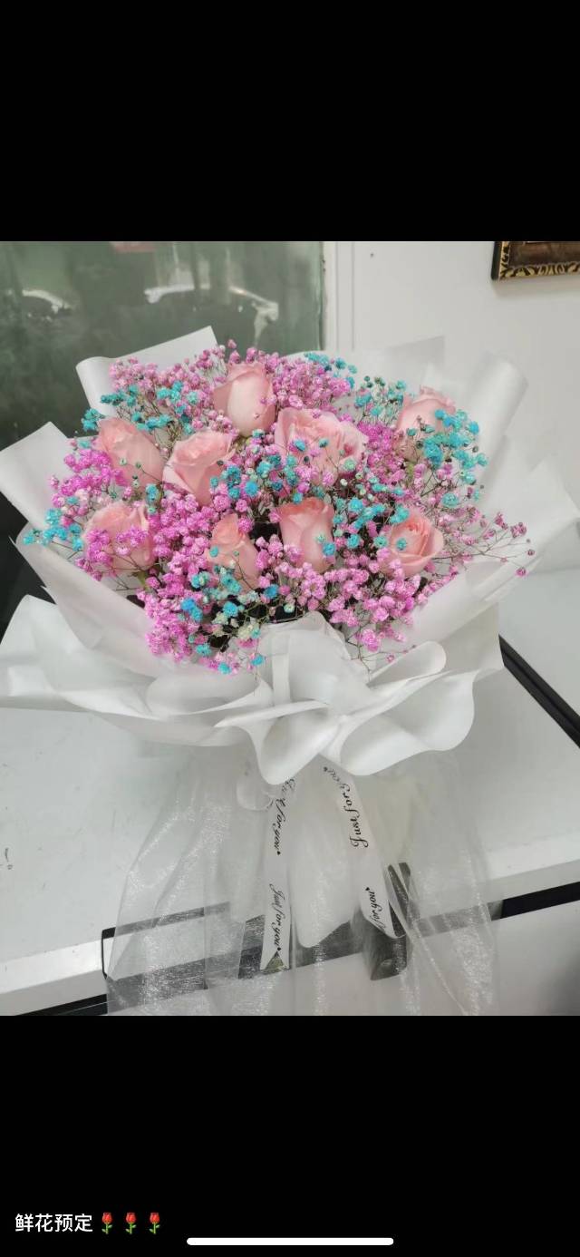 11朵粉玫瑰混搭粉蓝星鲜花束 ,如图包 |