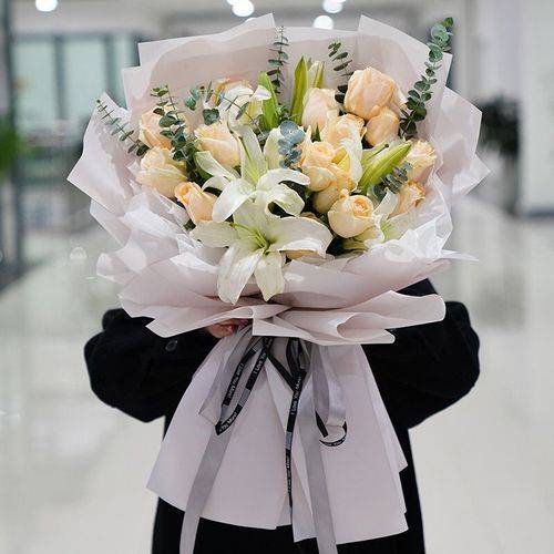 夜上海论坛19朵香槟加2支多头白百合花束,用绿和白的包装纸包花束 |