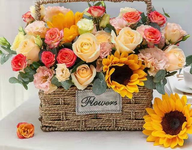 夜上海论坛10朵红康乃馨+9朵粉玫瑰+1支多头粉百合+2支向日葵花蓝。 |