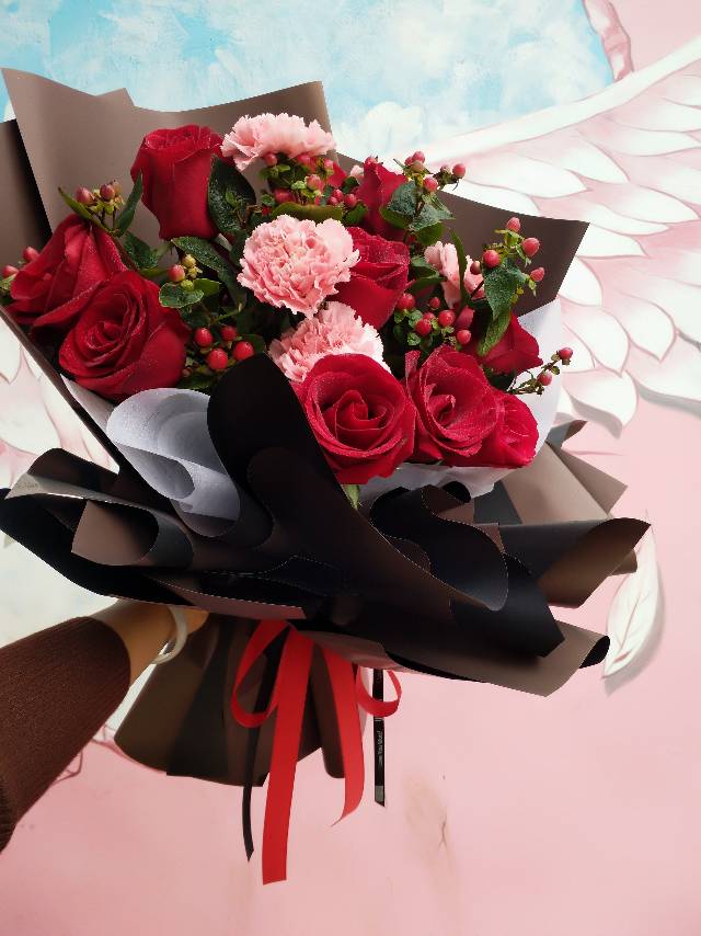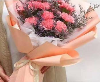 11朵粉色康乃馨4朵红玫瑰混搭花束 款式包装如图 |