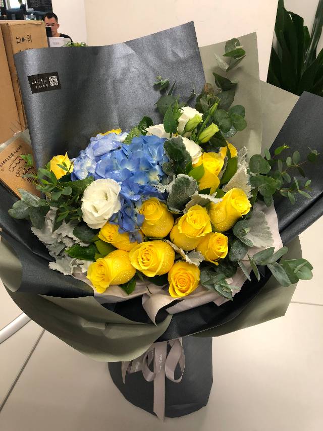 夜上海论坛15支黄玫瑰蓝绣球桔梗尤伽俐银叶菊混搭花束,如图制作 |