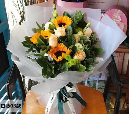 夜上海论坛5朵香槟玫瑰3朵向日葵花束,如图 |