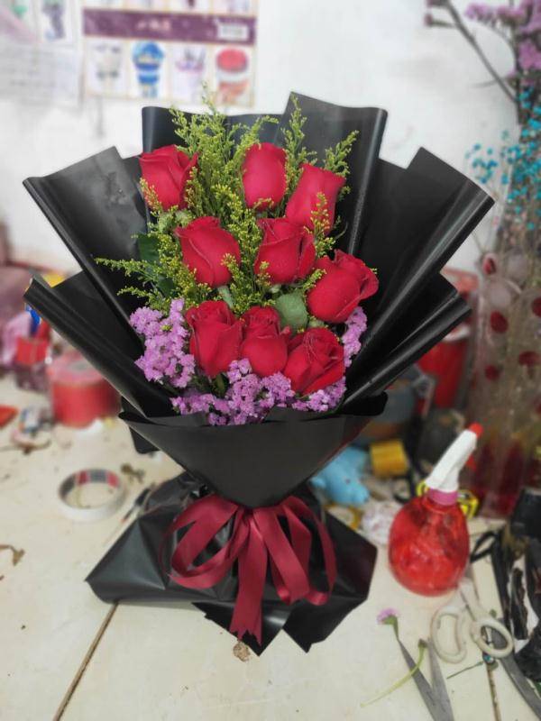 夜上海论坛9朵红玫鲜花束,包装纸用深蓝色的 |
