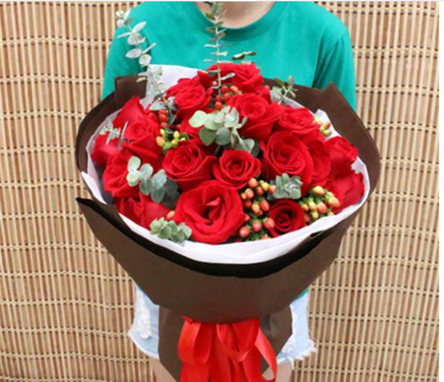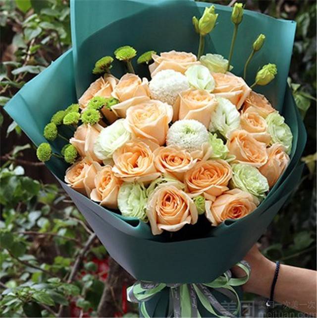 19朵香槟玫瑰桔梗如图,做好就送,送花前在电话确认一下(换粉玫瑰搭配好)