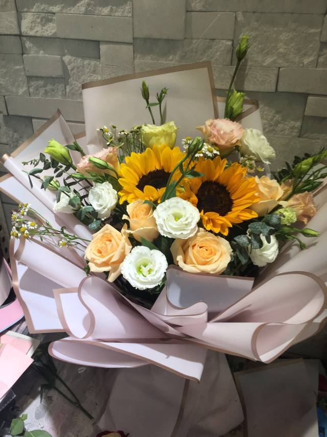 夜上海论坛16朵香槟玫瑰3朵向日葵梗桔鲜花束 如图包装 |