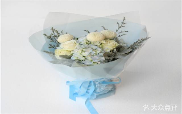 夜上海论坛3朵白玫瑰,1支淡蓝绣球,3朵白色乒乓菊, 配花:情人草,银叶菊 |
