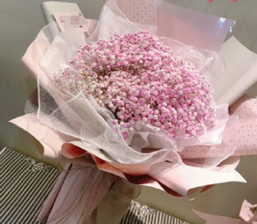 一束粉色的满天星,穿插几支紫色满天星花束,包装大气,有卡片,如图 |