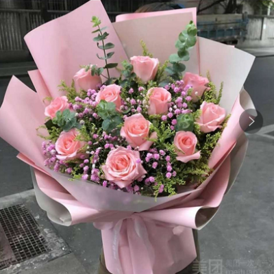 夜上海论坛11朵粉玫瑰花束(包装纸用粉色,没粉色就白色) |