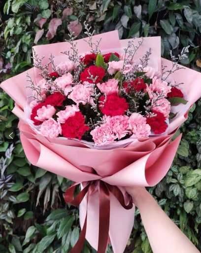 19朵红粉色康乃馨混搭花束(红色包装纸),如图 |