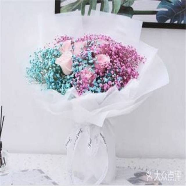 11朵香槟玫加尤加利鲜花束,包装纸用蓝色的 |