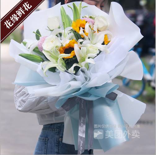 夜上海论坛2枝向日葵8朵白百合2枝乒乓菊洋桔梗混搭花束 |