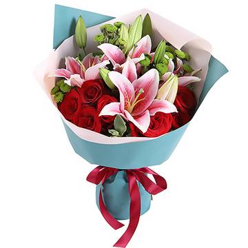 9枝红玫瑰,2枝粉色多头百合配红豆栀子叶 鲜花包装:内衬浅粉色雾面纸,外用蓝色雾面纸单面包装,红色蝴蝶结束扎。如图制作 |