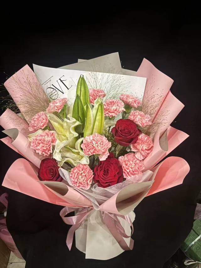 11支康乃馨3支红玫瑰1支百合花束 |