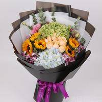 2绣球5向日葵8香槟玫瑰混搭花束,如图包装大气好看,有卡片 ,现在做好马上送。2张卡片 。 |