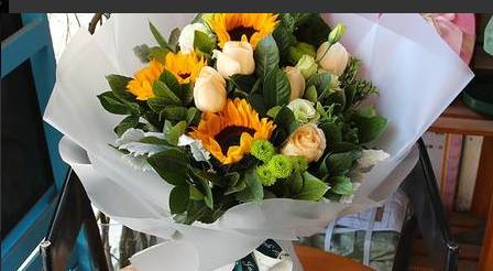 3朵向日葵加8朵香槟玫加尤加利做花束 |