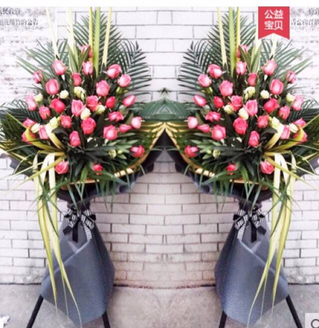 2个双层花篮:每个花材如下:60朵太阳花+8朵百合+3枝洋兰+1枝富贵竹+剑叶+巴西叶+栀子叶+散尾叶,搭配丰满,务必保证质量和新鲜度,如图效果丰满,看起来大气,以免客户投诉 |