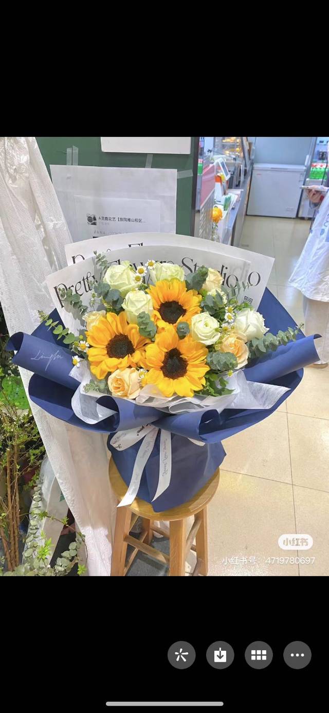 9支香槟玫瑰3支向日葵花束。搭配洋甘菊跟尤加利叶 |