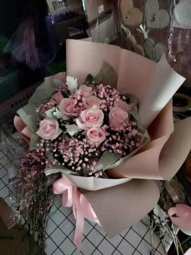 夜上海论坛11支粉玫瑰鲜花,粉满天星搭配,如图制作