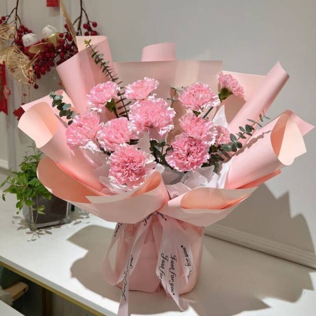 夜上海论坛11朵粉玫尤加利叶配点白色满天星花束 |