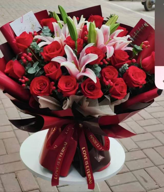 19朵红玫加粉百合鲜花束,如图包 |