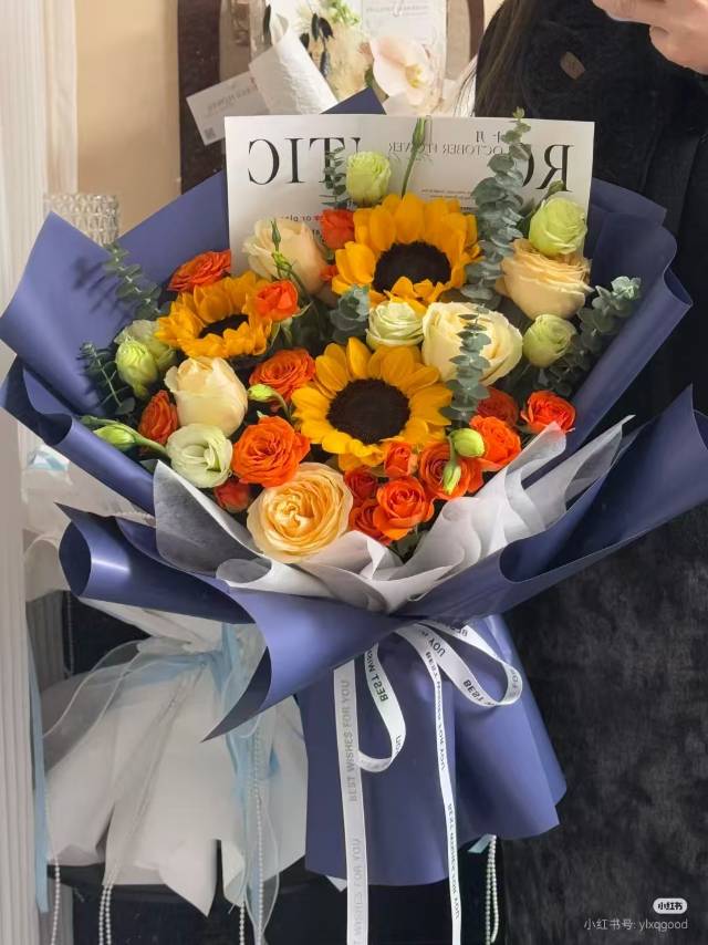 3支向日葵5支香槟玫瑰配橙泡泡洋桔梗混搭花束,如图 |