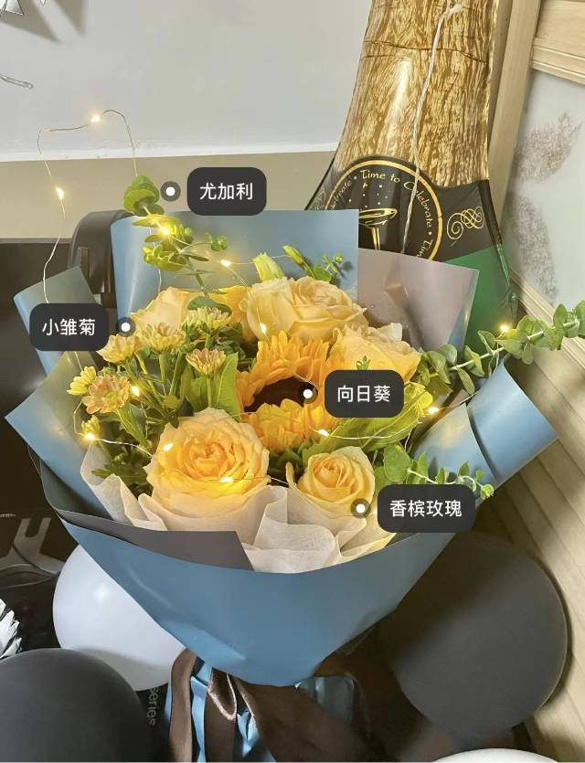 一支向日葵,6支香槟玫瑰,一些小雏菊,一些尤加利点缀,一条小灯串,包装纸蓝色 |