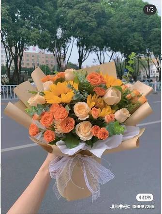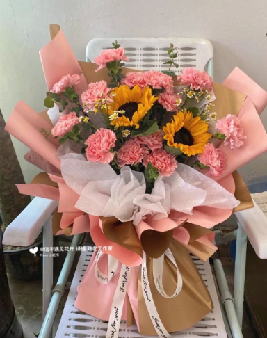 7朵香槟玫加3朵向日鲜花束,如图包 |