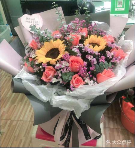 11朵粉玫瑰2朵向日葵混搭满天星花束,如图包装 |