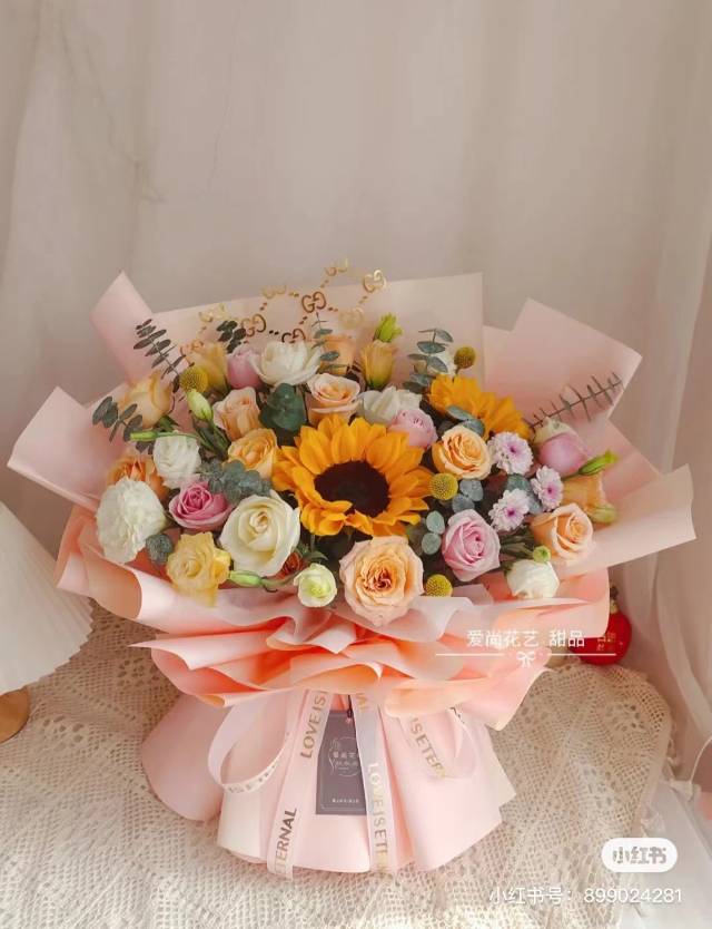 19支香槟,粉玫瑰+2支向日葵混搭花束,按图包 |