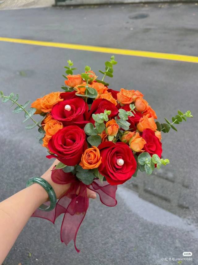 19支红玫配橙芭芘 红腊梅手捧花 |