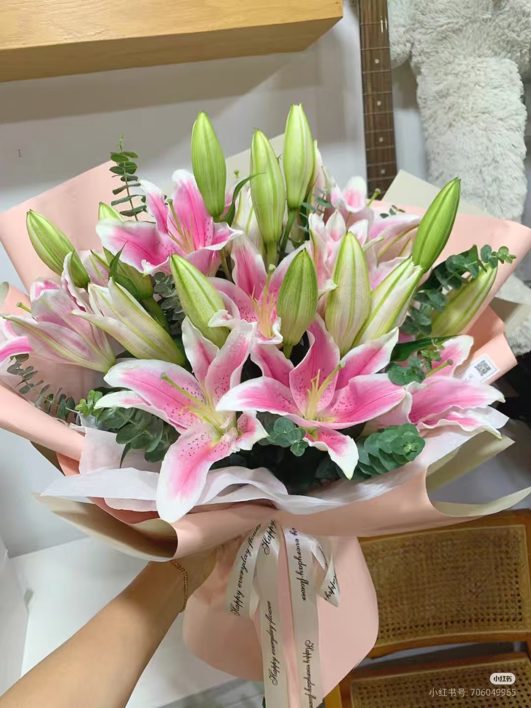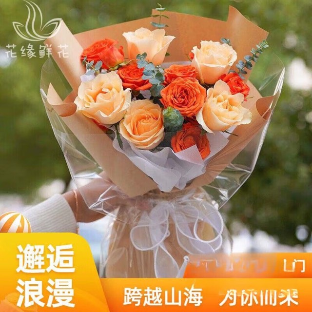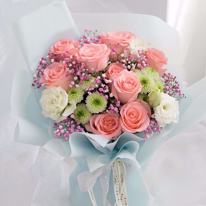 夜上海论坛11朵粉玫加白星加彩灯鲜花束,用图二的包装纸 |