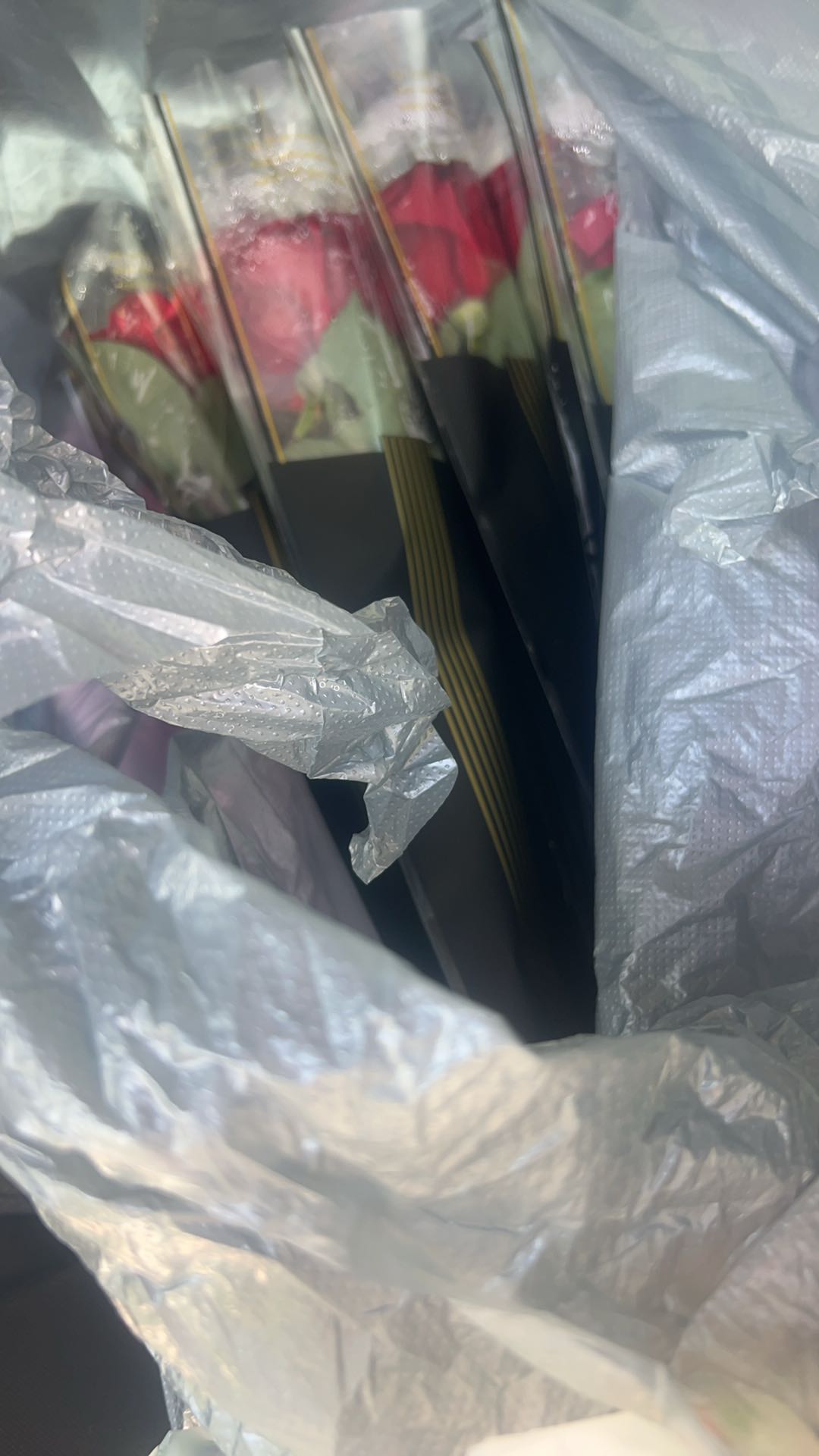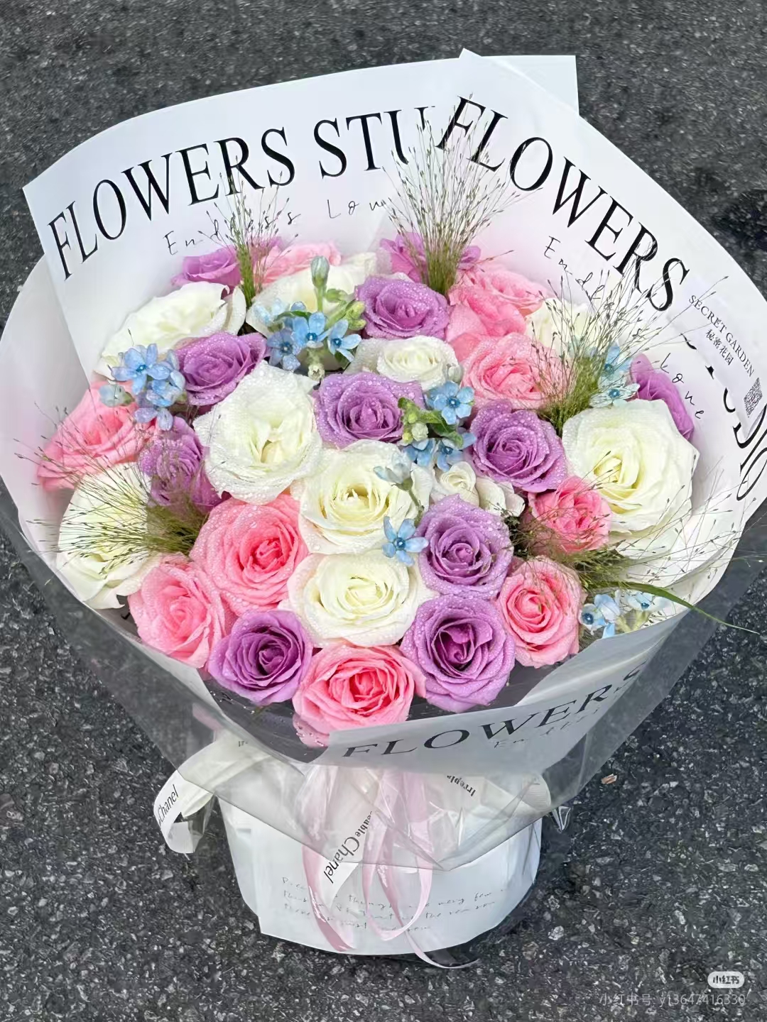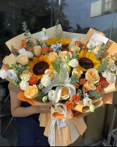 夜上海论坛19朵香槟玫瑰,两支白百合,3朵向日葵,配橙泡泡洋桔梗混搭花束,如图