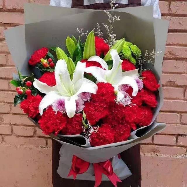 19支红色康乃馨2支多头白百合花束 |