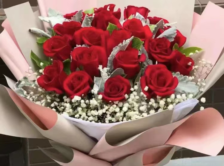夜上海论坛19朵红玫瑰配白色满天星花束,用白色纸包 |
