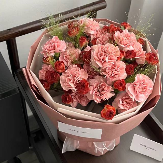 19枝粉色康乃馨巧配巧克力泡泡真花鲜花束,如图 |