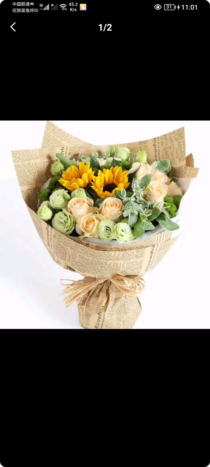 3支向日葵3支香槟玫瑰配橙泡泡绿叶花束 |