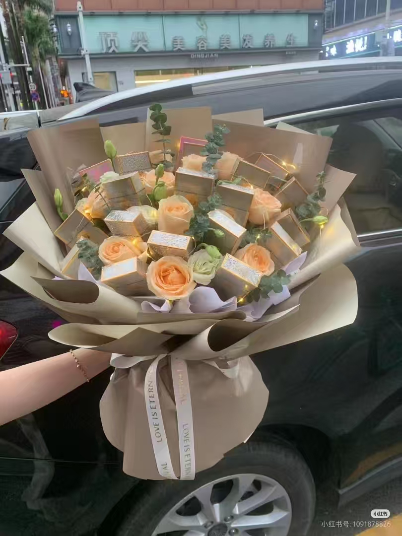 11朵香槟玫瑰3朵向日葵配洋桔梗跟橙色泡泡花束 |
