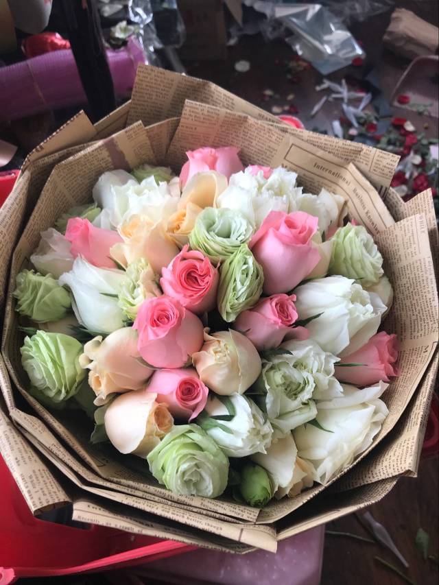 33朵混搭玫瑰花束(香槟,戴安娜)石竹梅搭配丰满,如图包装制作,保证新鲜度和质量