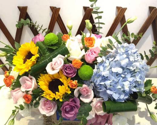 高级藤编手提花篮一个(香槟玫瑰8支,百合2支,粉玫瑰9支,紫皇后5支,小雏菊、桔梗尤加利叶搭配丰满),样式如果 |